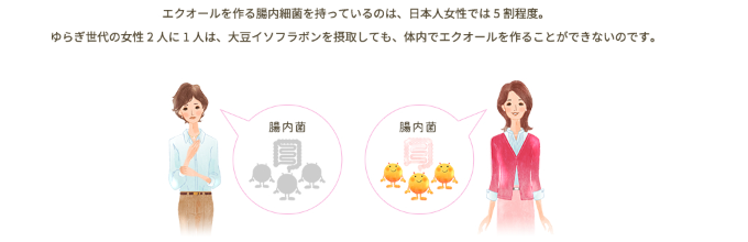 女性のからだに有用とされている大豆イソフラボン。この大豆イソフラボンが腸内細菌で変換されてできるエクオールという成分こそが、女性のゆらぎにいいと注目されています。